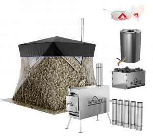 Баня палатка Морж LUX, печь Intent, каменка для печи, тент на палатку, 2 банные шапочки с...