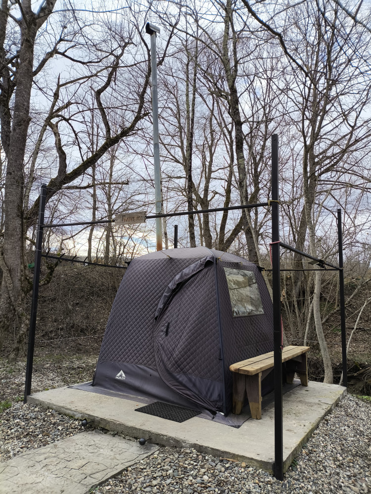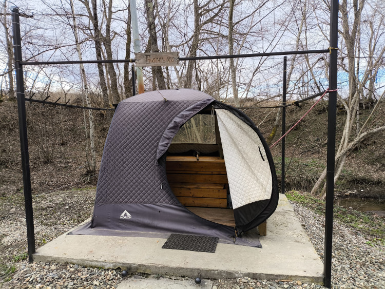 Купил эту баню-палатку более 2-х лет назад и очень ей доволен, держит пар замечательно, 2 окна - светло и виды природы замечательные! Использую баню стационарно, отлил площадку 3х3м, 4 столба с поперечинами для крепления растяжек и высокого дымохода, а также прожекторов в 2 окна, внутри полок двойной с вторым дыханием, печь-буржуйка с 40кг камней и парогенератором Intent (купил здесь же). Получилась отличная русская баня с температурой 60-70С (можно и больше натопить, просто не нужно) и влажностью 40-60% - мы балдеем в ней всей семьёй.