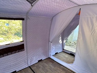 Просторная, есть тамбур, место для двух печек. Отличная мобильная баня, а зимой как палатки для рыбалки. Рекомендую докупить накидку и пол